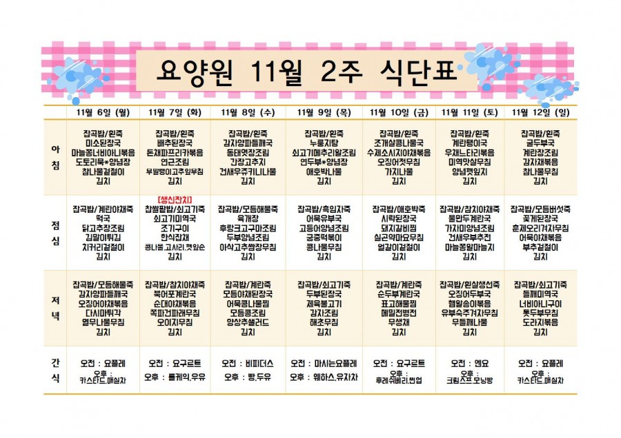 11월 1주 식단표입니다. 페이지 정보 작성자 노인전문요양원 댓글 0건 조회 418회 작성일 23-11-06 10:26 본문 ★ 쌀-국내산 / 잡곡(기장,보리,찹쌀,현미)-국내산 / 김치-국내산,중국산 고춧가루-국내산/ 계란-국내산 /두부-수입산★ 위 식단은 물품 수급 사정이나 식단 사정에 의하여 변동이 있을 수 있습니다. 목록 댓글목록 댓글목록 등록된 댓글이 없습니다.