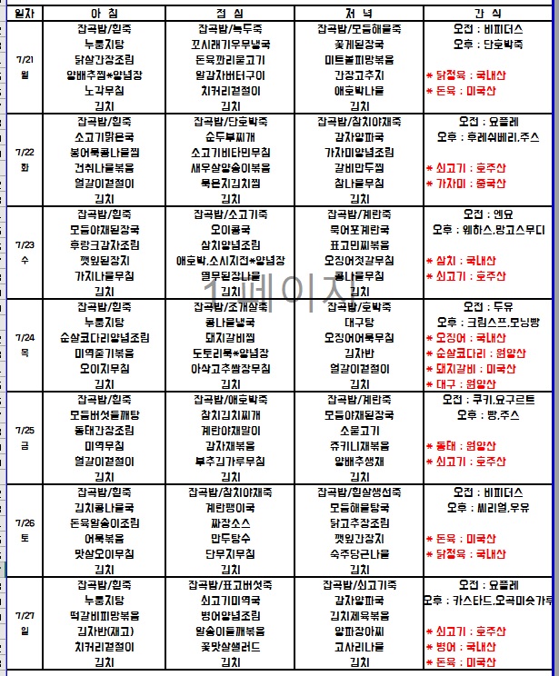7월 3주 식단표입니다. 페이지 정보 작성자 노인전문요양원 댓글 0건 조회 32회 작성일 25-09-18 18:38 본문 ★ 쌀-국내산 / 잡곡(기장,보리,찹쌀,현미)-국내산 / 김치-국내산 고춧가루-국내산/ 계란-국내산 /두부-수입산 ★ 위 식단은 물품 수급 사정이나 식단 사정에 의하여 변동이 있을 수 있습니다. 목록 댓글목록 댓글목록 등록된 댓글이 없습니다.