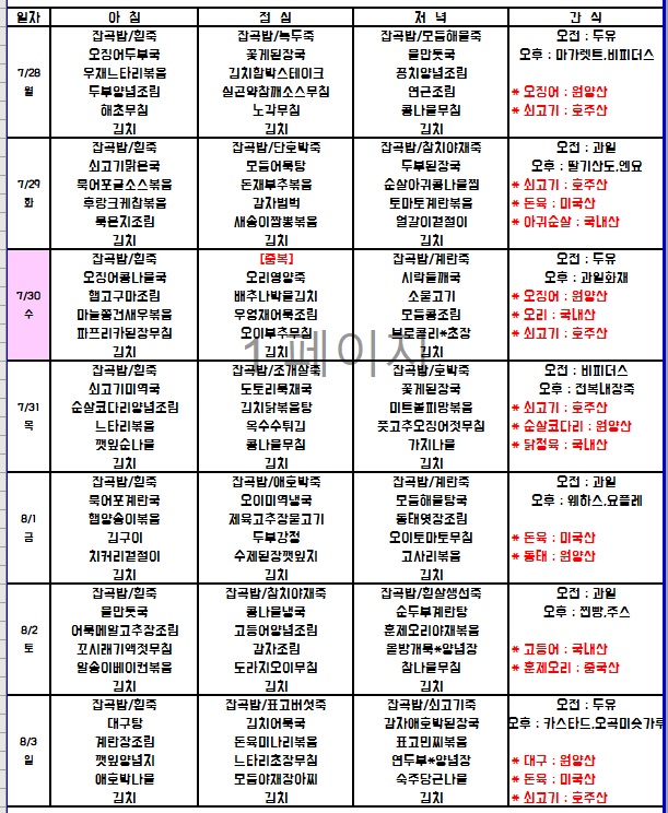 7월 4주 식단표입니다. 페이지 정보 작성자 노인전문요양원 댓글 0건 조회 31회 작성일 25-09-18 18:39 본문 ★ 쌀-국내산 / 잡곡(기장,보리,찹쌀,현미)-국내산 / 김치-국내산 고춧가루-국내산/ 계란-국내산 /두부-수입산 ★ 위 식단은 물품 수급 사정이나 식단 사정에 의하여 변동이 있을 수 있습니다. 목록 댓글목록 댓글목록 등록된 댓글이 없습니다.