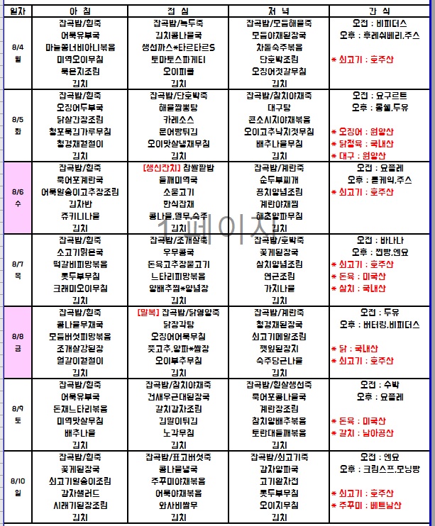 8월 1주 식단표입니다. 페이지 정보 작성자 노인전문요양원 댓글 0건 조회 28회 작성일 25-09-18 18:40 본문 ★ 쌀-국내산 / 잡곡(기장,보리,찹쌀,현미)-국내산 / 김치-국내산 고춧가루-국내산/ 계란-국내산 /두부-수입산 ★ 위 식단은 물품 수급 사정이나 식단 사정에 의하여 변동이 있을 수 있습니다. 목록 댓글목록 댓글목록 등록된 댓글이 없습니다.