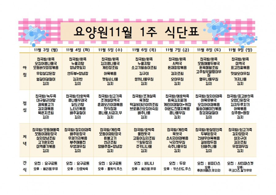 11월 1주 식단표입니다. 페이지 정보 작성자 노인전문요양원 댓글 0건 조회 17회 작성일 25-11-10 11:37 본문 ★ 쌀-국내산 / 잡곡(기장,보리,찹쌀,현미)-국내산 / 김치-중국산 고춧가루-국내산/ 계란-국내산 /두부-수입산★ 위 식단은 물품 수급 사정이나 식단 사정에 의하여 변동이 있을 수 있습니다. 목록 댓글목록 댓글목록 등록된 댓글이 없습니다.