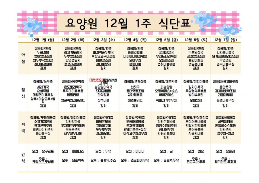 12월 1주 식단표입니다. 페이지 정보 작성자 노인전문요양원 댓글 0건 조회 13회 작성일 25-12-01 09:30 본문 ★ 쌀-국내산 / 잡곡(기장,보리,찹쌀,현미)-국내산 / 김치-중국산 고춧가루-국내산/ 계란-국내산 /두부-수입산★ 위 식단은 물품 수급 사정이나 식단 사정에 의하여 변동이 있을 수 있습니다. 목록 댓글목록 댓글목록 등록된 댓글이 없습니다.