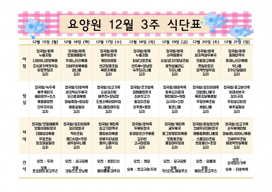 12월 3주 식단표입니다. 페이지 정보 작성자 노인전문요양원 댓글 0건 조회 8회 작성일 25-12-15 10:05 본문 ★ 쌀-국내산 / 잡곡(기장,보리,찹쌀,현미)-국내산 / 김치-중국산 고춧가루-국내산/ 계란-국내산 /두부-수입산★ 위 식단은 물품 수급 사정이나 식단 사정에 의하여 변동이 있을 수 있습니다. 목록 댓글목록 댓글목록 등록된 댓글이 없습니다.