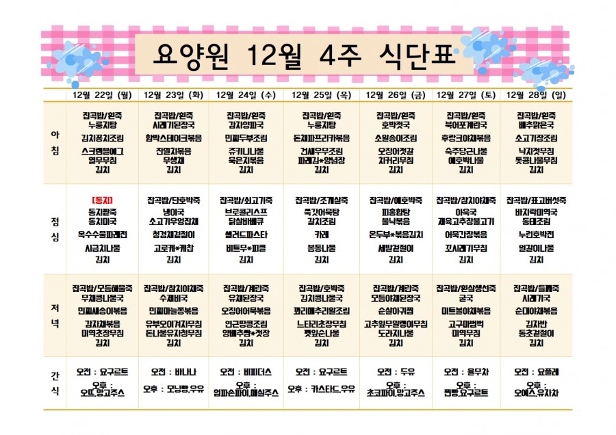 12월 4주 식단표입니다. 페이지 정보 작성자 노인전문요양원 댓글 0건 조회 7회 작성일 25-12-22 10:27 본문 ★ 쌀-국내산 / 잡곡(기장,보리,찹쌀,현미)-국내산 / 김치-중국산 고춧가루-국내산/ 계란-국내산 /두부-수입산★ 위 식단은 물품 수급 사정이나 식단 사정에 의하여 변동이 있을 수 있습니다. 목록 댓글목록 댓글목록 등록된 댓글이 없습니다.