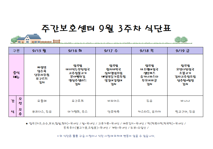 9월 3주차 식단표 페이지 정보 작성자 노인통합지원센터 댓글 0건 조회 27회 작성일 25-11-18 12:08 본문 9월 3주차 식단표 목록 댓글목록 댓글목록 등록된 댓글이 없습니다.