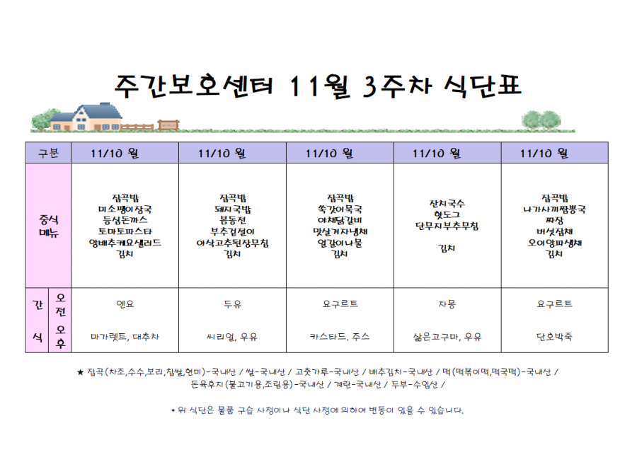 11월 3주 식단 페이지 정보 작성자 노인통합지원센터 댓글 0건 조회 28회 작성일 25-11-18 12:37 본문 11월 3주 식단 목록 댓글목록 댓글목록 등록된 댓글이 없습니다.