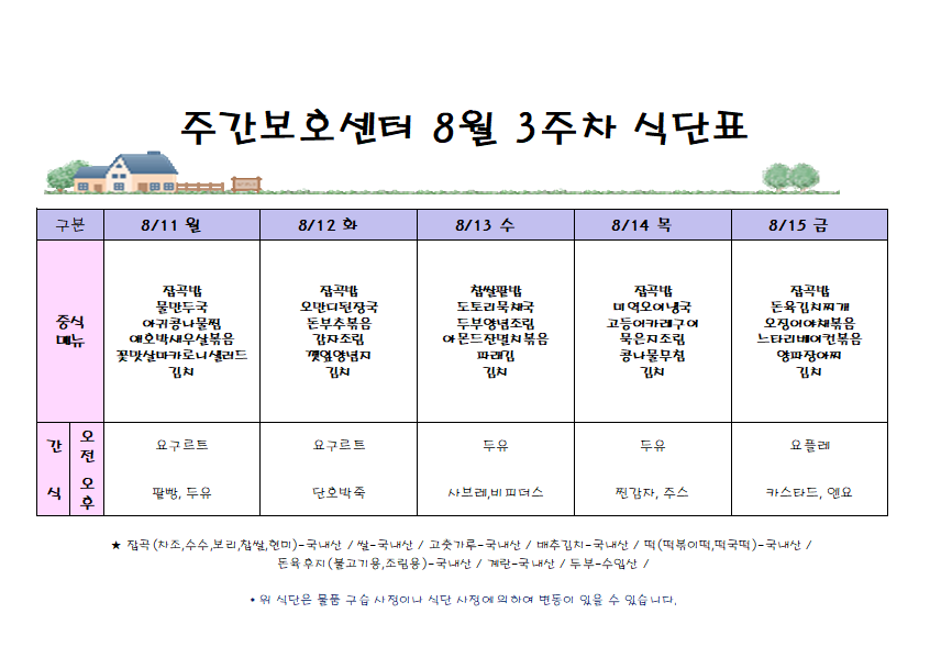 8월 3주차 식단표 페이지 정보 작성자 노인통합지원센터 댓글 0건 조회 27회 작성일 25-11-18 12:06 본문 8월 3주차 식단표 목록 댓글목록 댓글목록 등록된 댓글이 없습니다.