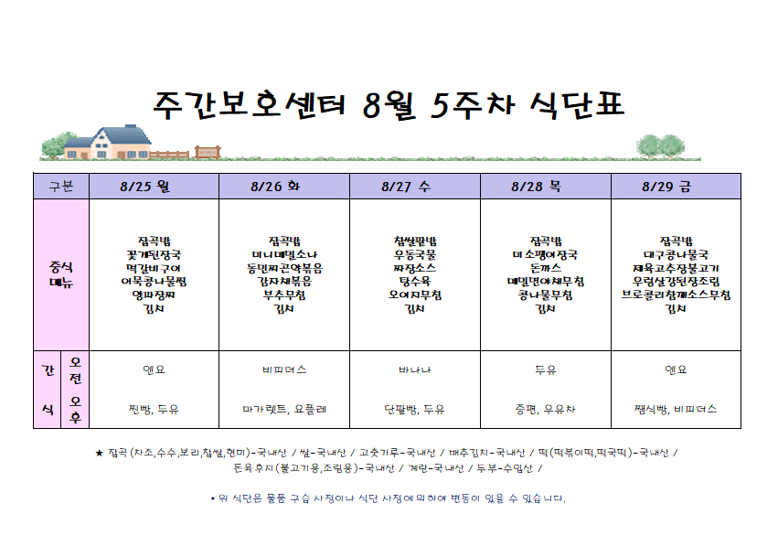 8월 5주차 식단표 페이지 정보 작성자 노인통합지원센터 댓글 0건 조회 26회 작성일 25-11-18 12:07 본문 8월 5주차 식단표 목록 댓글목록 댓글목록 등록된 댓글이 없습니다.