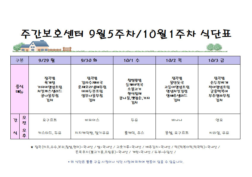9월 5주 10월 1주차 식단표 페이지 정보 작성자 노인통합지원센터 댓글 0건 조회 22회 작성일 25-11-18 12:09 본문 9월 5주 10월 1주차 식단표 목록 댓글목록 댓글목록 등록된 댓글이 없습니다.