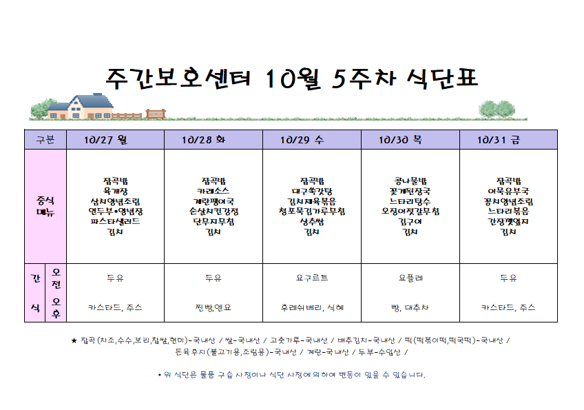 10월 5주차 식단표 페이지 정보 작성자 노인통합지원센터 댓글 0건 조회 23회 작성일 25-11-18 12:10 본문 10월 5주차 식단표 목록 댓글목록 댓글목록 등록된 댓글이 없습니다.