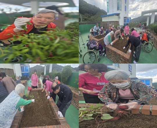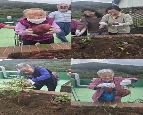 고구마 순이 한가득 자라 있어 줄 제거와 함께 고구마도 수확하였고, 빨갛게 익어버린 고추, 길게 자라 매달려 있는 가지 등 수확할 작물들을 수확한 후, 새롭게 상추와 대파, 쪽파 등을 심었습니다. 올해는 작년에 비해 고구마 수확이 좋아 어르신들도 기뻐하셨습니다.
