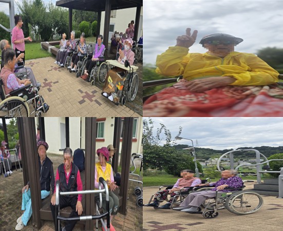 오늘은 가을 바람도 살랑 살랑 불어주어 어르신들을 야외 정자에 모셨습니다. 모처럼 자연 바람을 쐬니 어르신들도 기분이 좋으신지 노래를 따라 부르시며 얼굴에는 환한 미소 가득이셨습니다. 가을이 짧고 금방 추워진다고 하니 날이 좋을 때는 자주 산책하는 시간 가지도록 할게요. 어르신들~