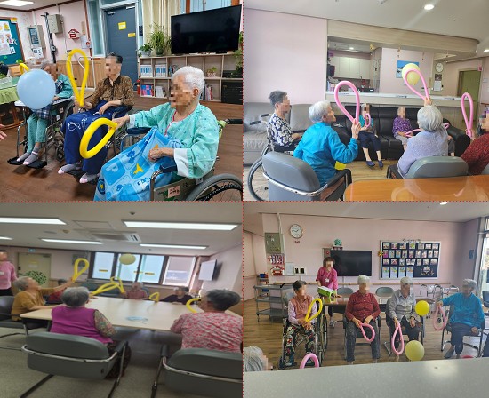 어르신들이 적당한 거리를 두고 앉으셔서 하는 배드민턴이었는데 밖으로 나가는 풍선은 중간에 계신 케어선생님들의 도움으로 어르신들