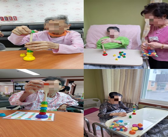 하지만 본인이 좋아하는 색깔만 꽂으시기도 하시고, 순서 상관없이 꽂아보시며, 옆 어르신들과 대화도 나누시며 즐겁게 활동하셨습니다.