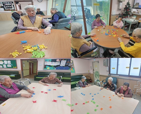 11월 7일 개구리 점프 페이지 정보 작성자 노인전문요양원 작성일25-11-10 15:01 조회13회 댓글0건 관련링크 목록 본문 어르신들과 개구리 점프 게임을 해 보았습니다. 멀리 점프하기, 점프하여 뒤집기등 어르신들에 따라서 진행방법을 달리하여 진행하였습니다. 손가락의 힘만으로도 폴짝 점프하는 개구리를 보고 재미있어 하시며, 생기 넘치는 여가 시간을 보내셨습니다. 댓글목록 등록된 댓글이 없습니다. 목록