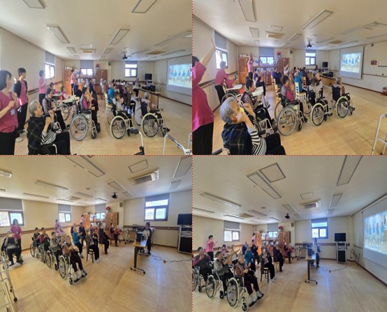 신체를 움직이실 수 있는 범위 내에서 팔을 위로 쭉쭉 뻗어 보기도 하고, 어깨도 살살 돌려보는 등의 율동으로 스트레칭 및 관절 구축 예방 효과까지 기대하며 적극적으로 참여 해주셨고, 운동 된다며 고맙다고 말씀해주셨습니다.