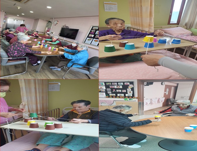 12월 10일 컵 옮기기 페이지 정보 작성자 노인전문요양원 작성일25-12-11 17:23 조회16회 댓글0건 관련링크 목록 본문 둘이서 또는 넷이서 한마음이 되어 컵을 옮겨보았습니다.적당하게 힘 조절이 필요했으며, 쌓아 올려야 마무리 되는 활동이었답니다.우리 어르신들 하나, 둘, 하나, 둘 협동심이 최고시죠? 댓글목록 등록된 댓글이 없습니다. 목록