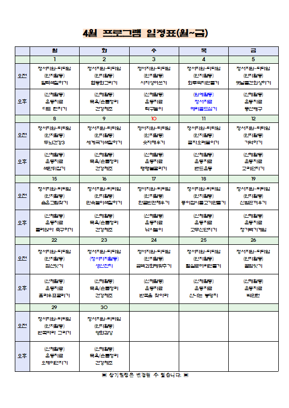 주간보호 4월 프로그램 일정표 페이지 정보 작성자 노인통합지원센터 댓글 0건 조회 3회 작성일 25-11-27 16:08 본문 주간보호 4월 프로그램 일정표 목록 댓글목록 댓글목록 등록된 댓글이 없습니다.