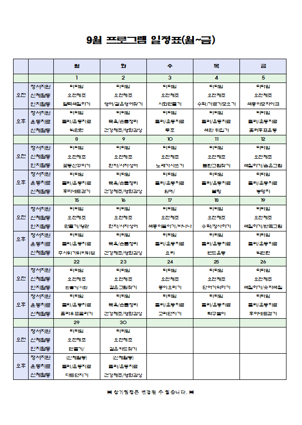 주간보호 9월 프로그램 일정표 페이지 정보 작성자 노인통합지원센터 댓글 0건 조회 3회 작성일 25-11-27 16:13 본문 주간보호 9월 프로그램 일정표 목록 댓글목록 댓글목록 등록된 댓글이 없습니다.