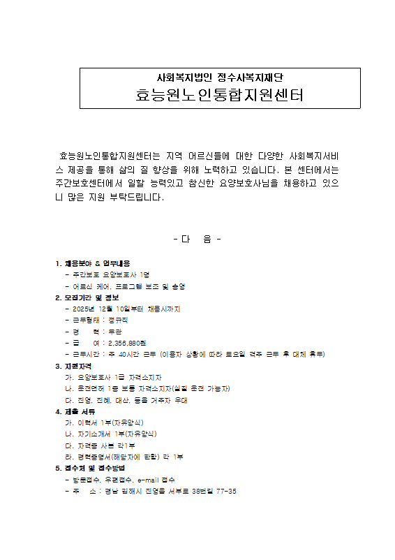 2025년 12월 효능원노인통합지원센터 요양보호사(주간보호) 구인 페이지 정보 작성자 노인통합지원센터 댓글 0건 조회 3회 작성일 25-12-12 13:21 본문 효능원노인통합지원센터 요양보호사(주간보호) 구인 목록 댓글목록 댓글목록 등록된 댓글이 없습니다.